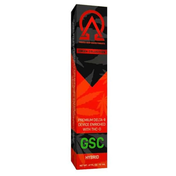 GSC Premium Delta 8 THC-O Disposable is second to none. Our GSC THC-O disposable is part of our Omega Collection. Its strain profile is a Hybrid that is Indica dominant, and a cross between OG Kush and Durban Poison. The flavor profile includes hints of citrus, mint, and sweet cherry.
