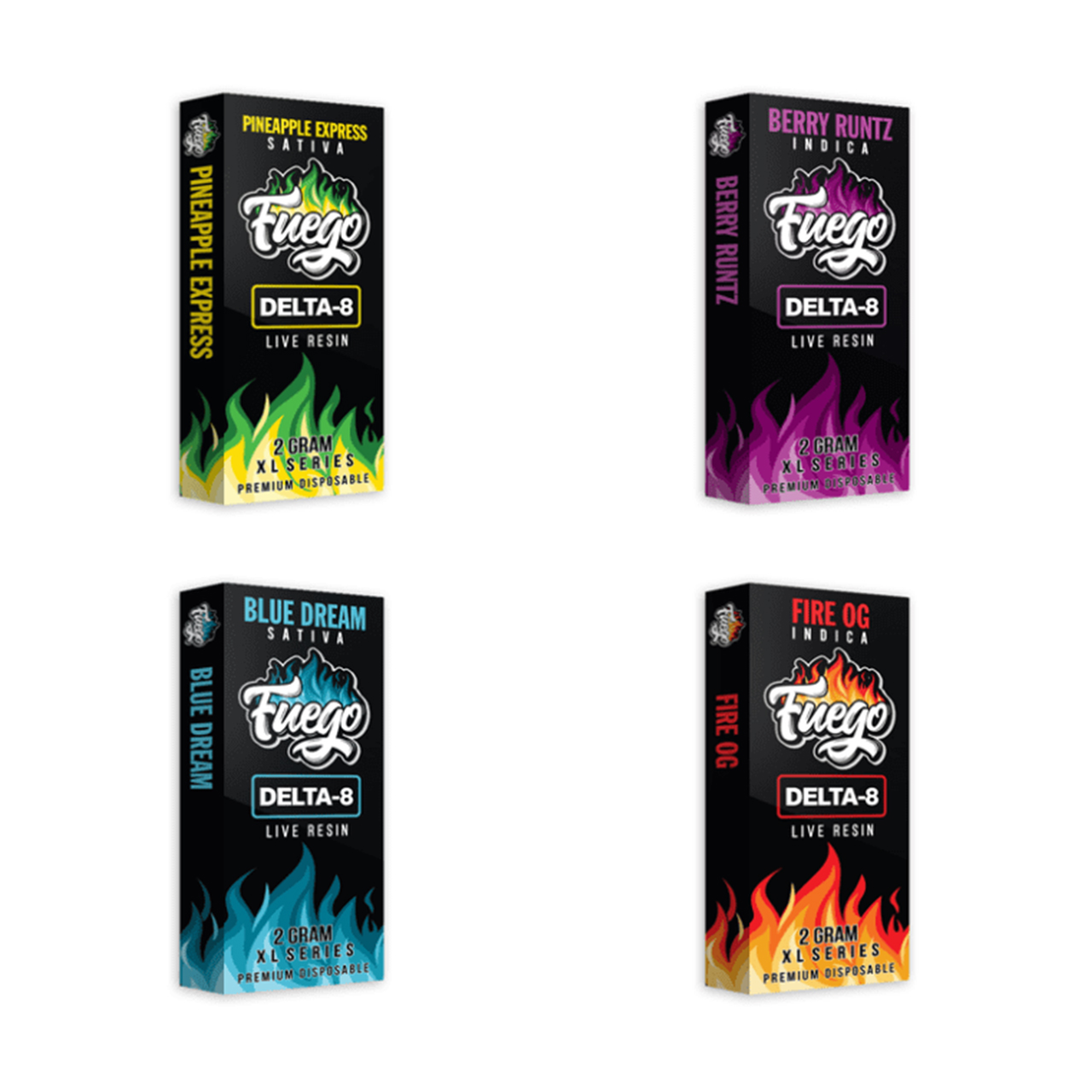 Think youve already found your favorite delta 8 disposable Well its time to scratch that thought. Presenting the all-new Fuego Delta 8 Disposable! This disposable contains 2 grams of live resin extracted delta-8 THC blended with strain specific naturally-derived terpenes. Live resin extracts are used to preserve a higher abundance of cannabinoids and trichomes which result in more potent and flavorful experiences.Fuego D8 Disposables are crafted using the latest innovative technology to avoid clogs, leaks, and faulty batteries. Its ceramic coil provides better tasting hits, longer distillate lifespan, and heats the distillate to optimal temperatures for an unbeatable smoke.This disposable is offered in 8 mouth-watering strains.Product FeaturesCompliant with the 2018 Farm Bill2 gram delta-8 THC disposableLive resin extractRechargeableCeramic coilThird-party lab tested