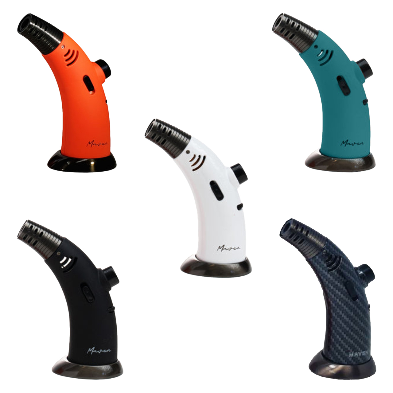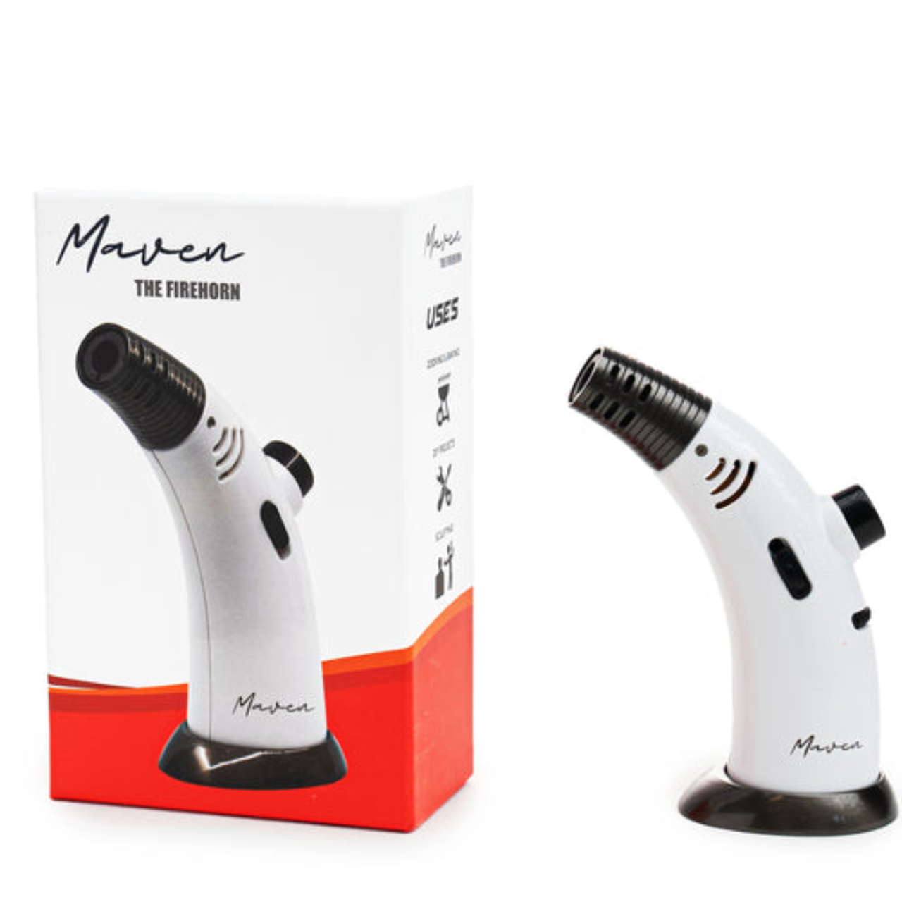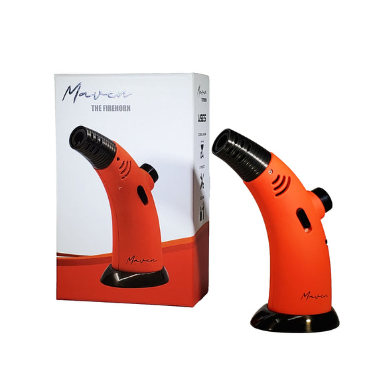 The Maven Firehorn is our newest addition to our Maven collection and features a limited edition handheld angled jet torch with a solid base foundation and smooth yet intuitive design. This powerful device stands at 5 inches tall with a wide refillable butane tank structure and angled top for strategic and precise lighting. The Firehorn can also opened and locked as desired for safety purposes as well as adjusted for flame intensity