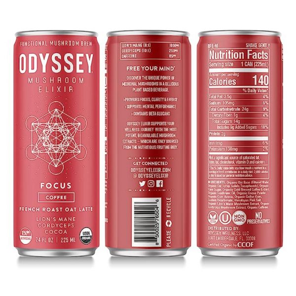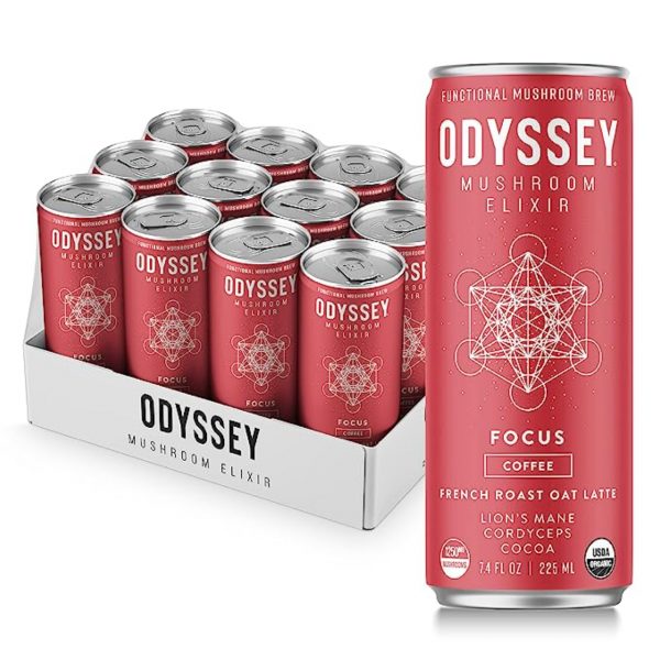 Odyssey Elixir Energy and Focus Coffee Mushroom Drink, French Roast Oat Latte Flavor – 12oz (Pack Of 12)