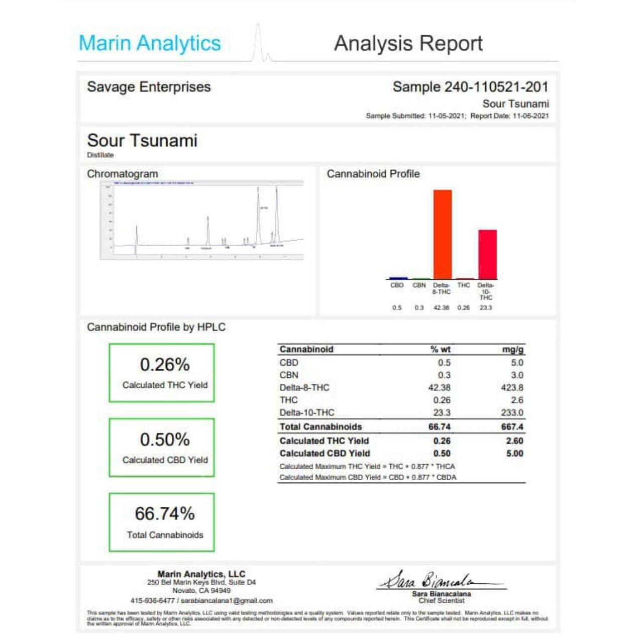 Our Sour Tsunami Sugar Extrax Disposable features Delta 8 THC, Delta 10 THC and THC-O. At 2 grams of distillate, you’re getting a unique flavor profile of citrus, pine, and hints of a woody flavor. This strain is most notable for being first bred by Lawrence Ringo of the Southern Humboldt Seed Collective. Although this strain is Sativa dominant, users report having a relaxed experience along with happiness and euphoria that is commonly associated with this strain profile.